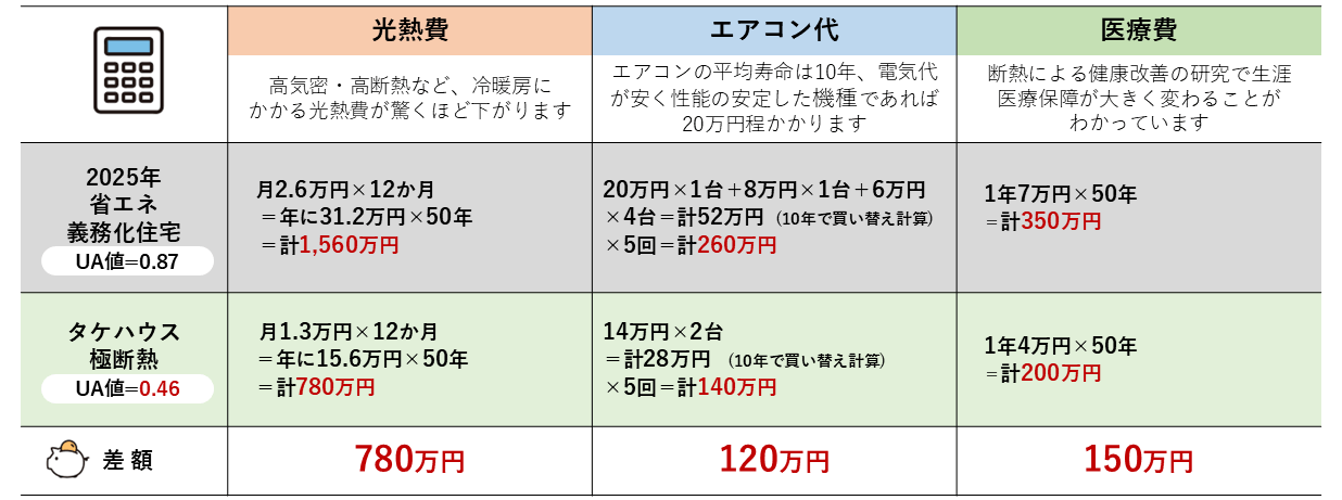 タケハウスの「極断熱」だと50年間で
